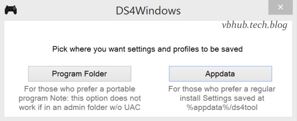 Ardından, rar dosyasını bilgisayarınızda bir yere çıkarttıktan sonra DS4Windows.exe programına çift tıklayın. Program açıldıktan sonra size aşağıdaki gibi bir uyarı verecek, buna “Appdata“seçeneğine tıklayarak devam edebilirsiniz.